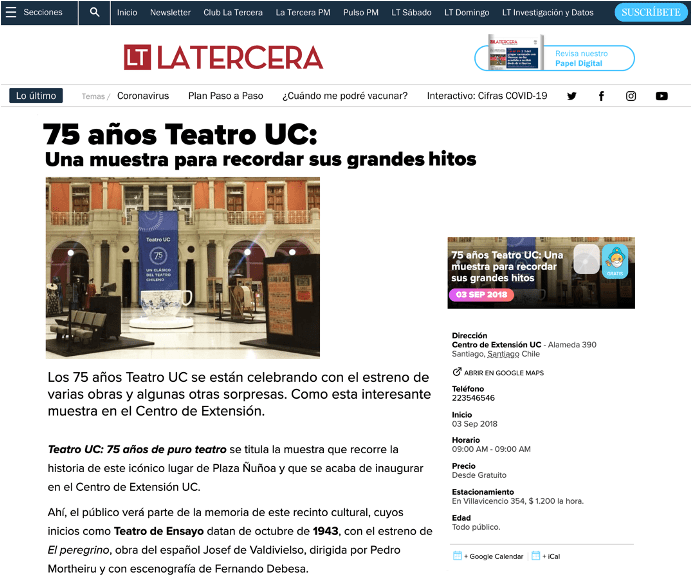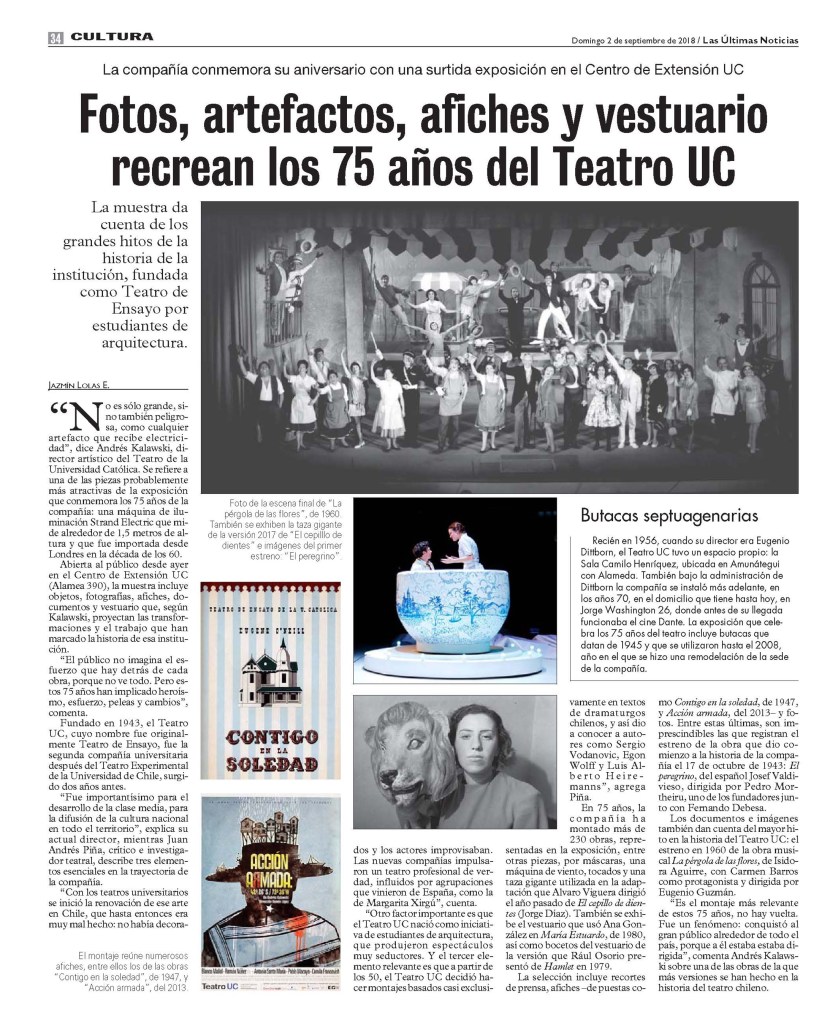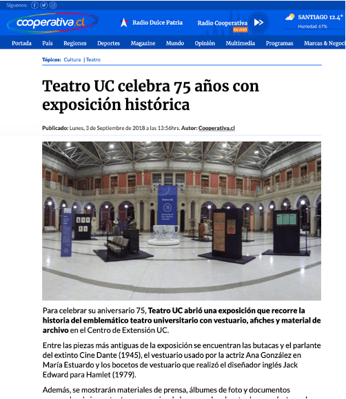 Exposición en conmemoración al aniversario de los 75 años del Teatro UC, en él se presentan diferentes materiales de archivo del teatro: afiches, vestuarios emblemáticos, textos, fotografías históricas, cuadernillos, máscaras, utilerías, maquinarias y escenografías. La exposición se realiza en la explanada del Centro de Extensión UC.