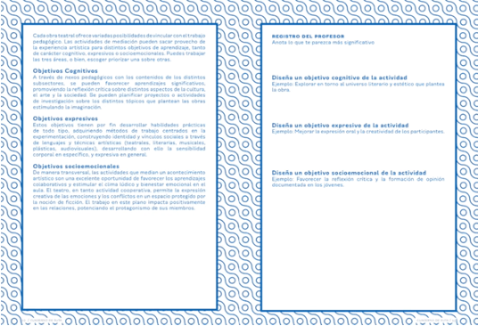 Cuaderno de Ruta está creado para profesores de educación básica y media, facilitadores teatrales y monitores de distintos contextos escolares o extra-escolares. El material está diseñado para vincular la experiencia de ser espectadores de teatro, con los distintos procesos pedagógicos a través de actividades creadas a medida para cada grupo. En este cuaderno se encontrará una guía para el diseño, aplicación y evaluación de estas actividades para la mediación teatral. Se invita a explorar esta ruta hacia la mediación teatral y a diseñar las actividades según el contexto de cada establecimiento. En este recorrido encontrarán estrategias para observar los entornos, a las personas y a sí mismos para encontrar claves para el diseño de la mediación. El proyecto se basa en la idea de que cada contexto es distinto, cada profesor maneja diferentes herramientas, y cada grupo de estudiantes tiene sus propias particularidades. De este modo, los objetivos y actividades para mediar una obra de teatro serán distintos en cada entorno y grupo.